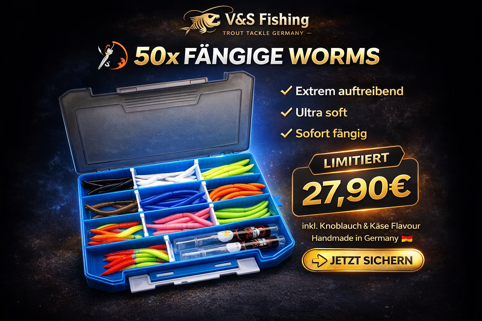 Du kriegst in dieser Box 50 extrem fängige, mega softe und stark auftreibende Würmer in 10 unterschiedlichen Farben, jeweils 5 Stück pro Farbe. Obendrauf gibt’s noch zwei richtig coole Flavours: Knoblauch und Käse. Und das Ganze für 27,90 €. Damit bist du am Wasser auf jeden Fall top ausgerüstet!