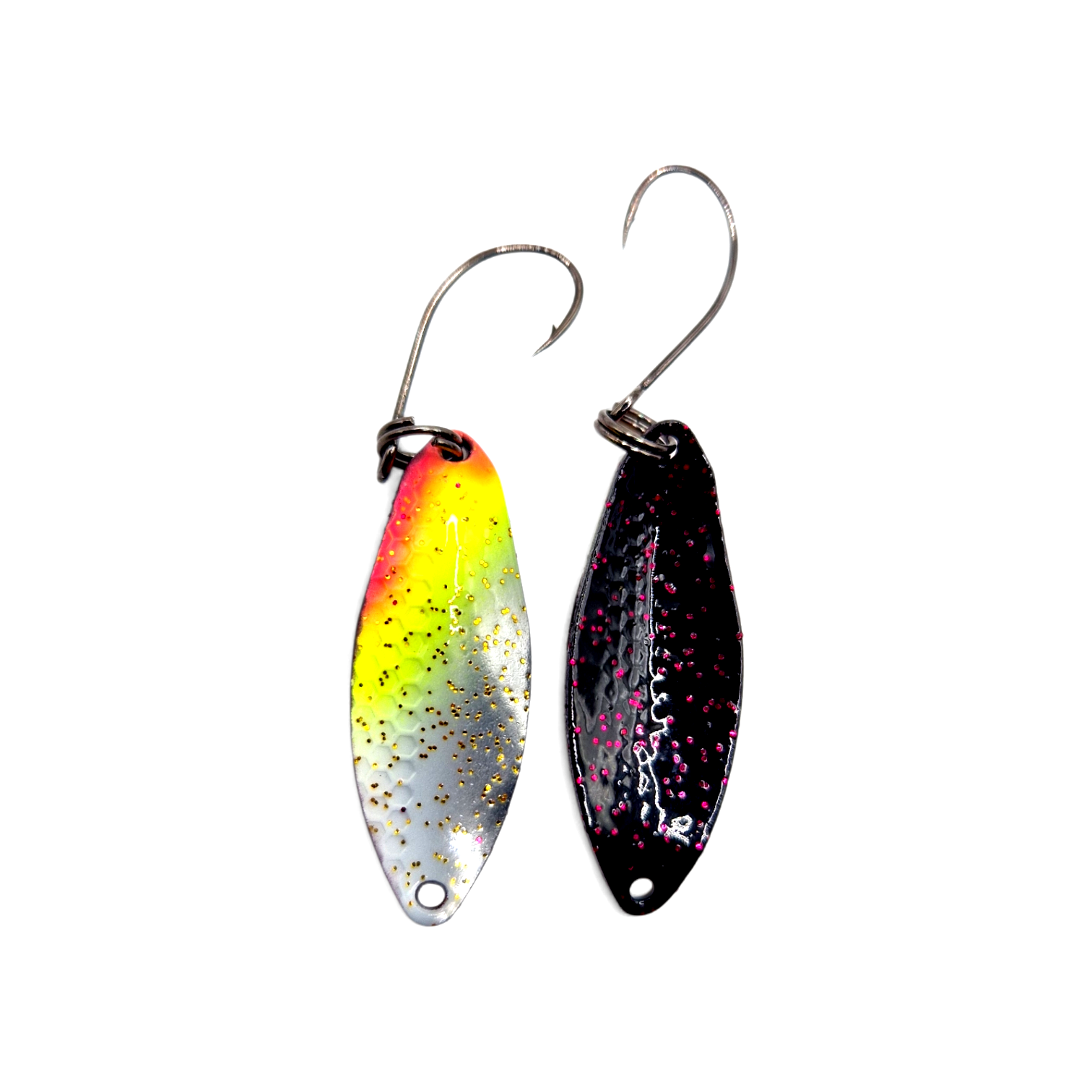 Der Spoon im GH Style ist ein Spoon, der durch seine Form überzeugt. Lang und breit zugleich, mit einer mittigen „Kante“ diese fließend in einer Y-Form endet. Die eine Hälfte des Spoons hat dabei mehrere optische Einschnitte, die bei der Führung für einen einmaligen Effekt sorgen. In Kombination mit seinem einmaligen Lauf, lässt dieser Spoon selbst die trägsten Forellen nicht kalt! Gewicht des Spoons 2,5 Gramm, Verpackungsinhalt 1 Stück.