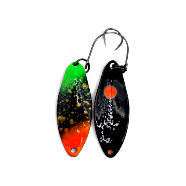 Spoon im GH Style ist ein Spoon, der durch seine Form überzeugt. Lang und breit zugleich, mit einer mittigen „Kante“ diese fließend in einer Y-Form endet. Die eine Hälfte des Spoons hat dabei mehrere optische Einschnitte, die bei der Führung für einen einmaligen Effekt sorgen. In Kombination mit seinem einmaligen Lauf, lässt dieser Spoon selbst die trägsten Forellen nicht kalt! Gewicht des Spoons 2,5 Gramm, Verpackungsinhalt 1 Stück.